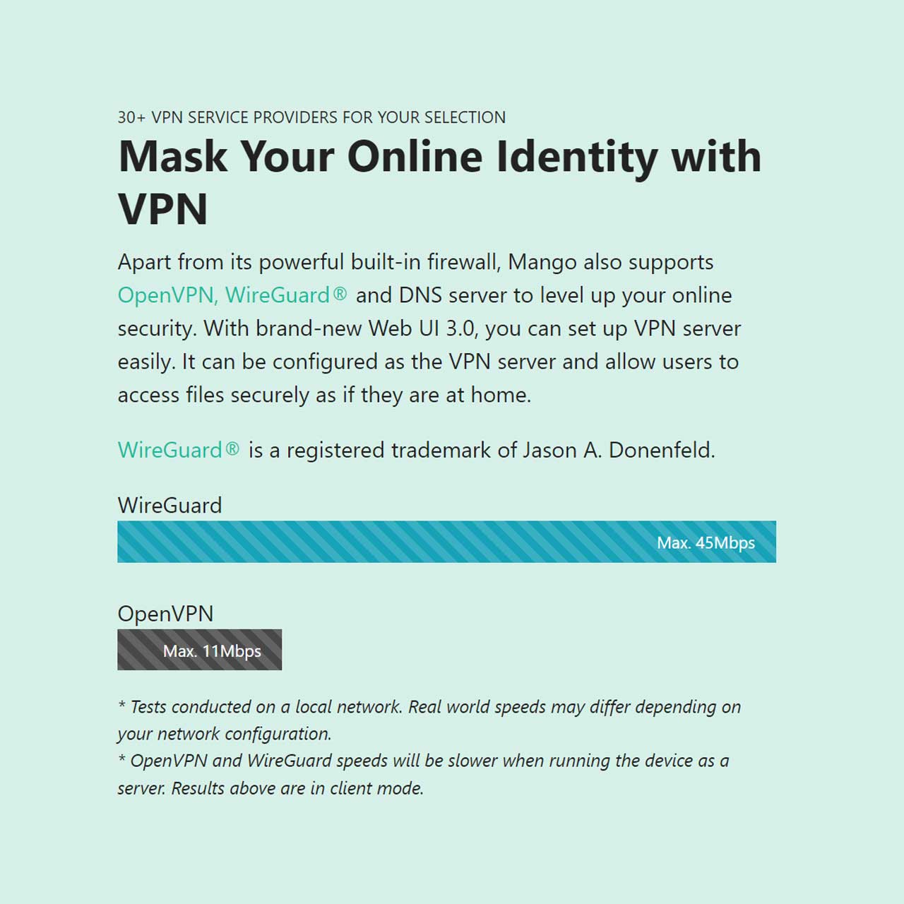 روتر GL.iNet Mango (GL-MT300N-V2) یک روتر وایرلس سبک و قابل حمل است که با پشتیبانی از WireGuard و OpenVPN امنیت بالا و سرعت 300Mbps را ارائه می‌دهد. این دستگاه با مصرف انرژی پایین و طراحی کوچک، گزینه‌ای عالی برای سفر و اشتراک اینترنت از طریق پورت LAN به شمار می‌آید.