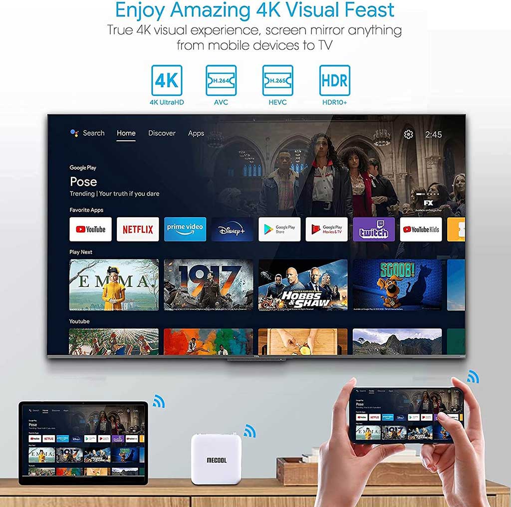 اندروید تیوی باکس Mecool KM6 Deluxe Edition یکی از محصولات حرفهای برند معتبر میکول است که با گواهی رسمی گوگل (Google Certified) و سیستمعامل Android TV 10 با لانچر Google TV عرضه میشود. این دستگاه با پردازنده قدرتمند Amlogic S905X4 چهارهستهای، رم ۴ گیگابایت و حافظه داخلی ۶۴ گیگابایت، اجرای نرم و روان فیلمها، بازیها و اپلیکیشنهای اندرویدی را تضمین میکند. پشتیبانی از وضوح 4K Ultra HD همراه با فناوریهای HDR10+، Dolby Digital Plus و HLG، کیفیت تصویر و صدایی خیرهکننده را برای کاربران فراهم میسازد.